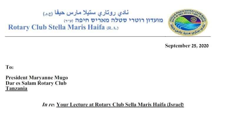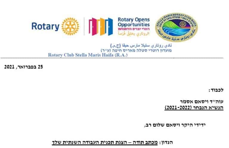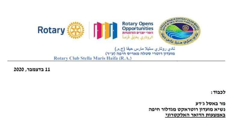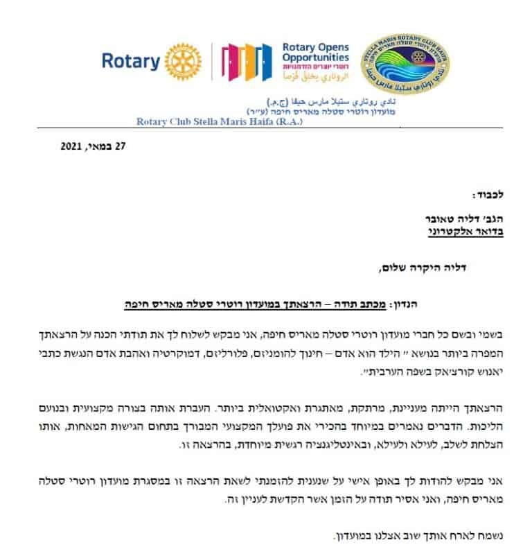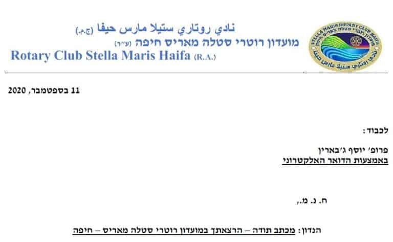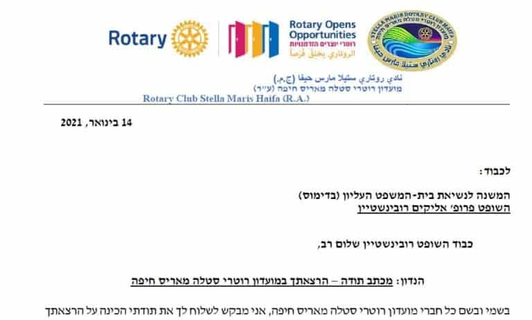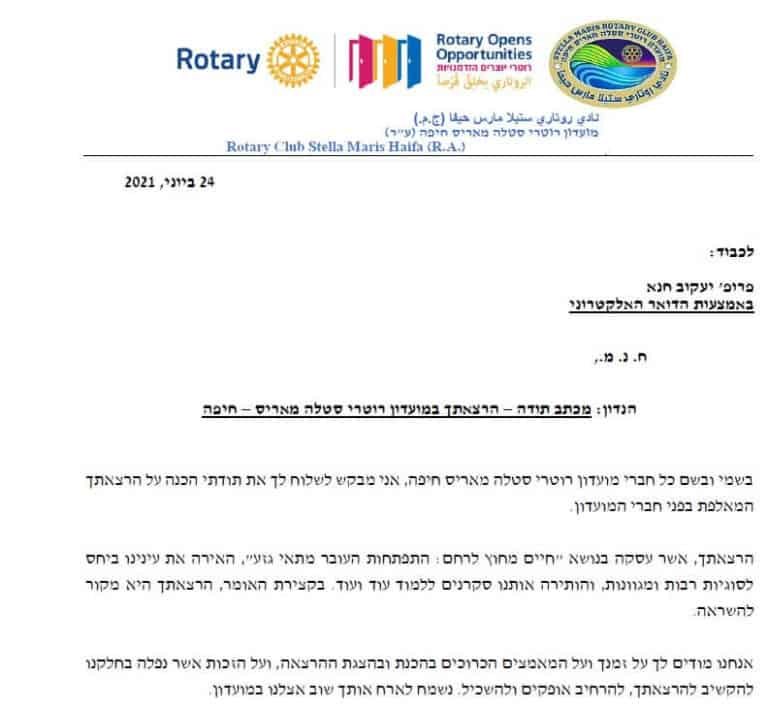 رسالة شكر لعميد روتاري إسرائيل ، المحامي الدكتور ناحوم فرنكل