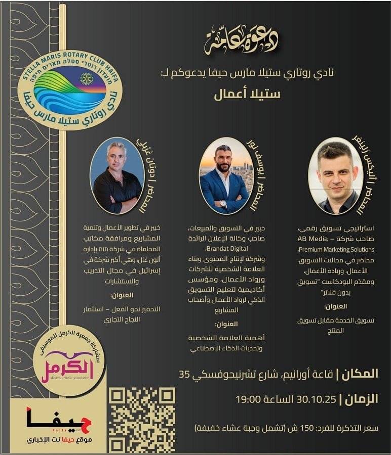 نادي روتاري ستيلا مارس حيفا عبر مسار المهنة ومن باب رغبته بالعطاء لمجتمعه الحيفاوي الحبيب تألق مساء الخميس ٣٠ تشرين اول (١٠) ٢٠٢٥ اذ اعَدّ وقدم مؤتمراً زاخراً رائعاً احتضن تحديات الحاضر في مجال التسويق، تطوير الاعمال والنجاح في المشاريع في زمن الذكاء الاصطناعي عبر ثلاثة اختصاصيين قدموا ثلاثة محاضرات مميزة في قاعة اورانيم التي غصَّت بالحضور من عشرات اعضاء النادي والعشرات الكثيرة من الضيوف من مختلف الاجيال والخلفيات المهنية.